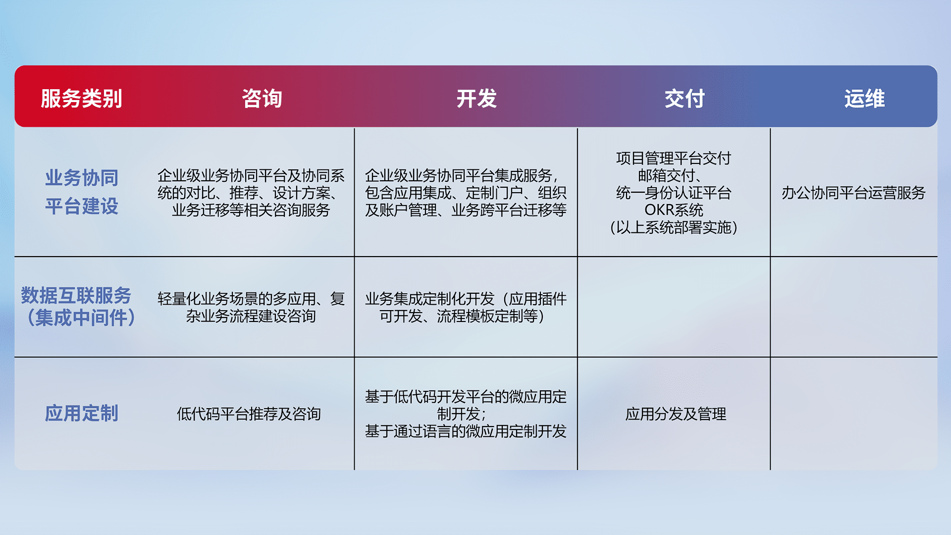 针对钉钉、、、企微、、、IDaas等平台级产品提供产品的规划、、、方案、、、交付、、定制化开发等服务,,实现如统一协同办公、、、智能客户服务、、、混合会议管理、、、智能数据查询、、、、等业务场景,,,,实现数字化转型。。。